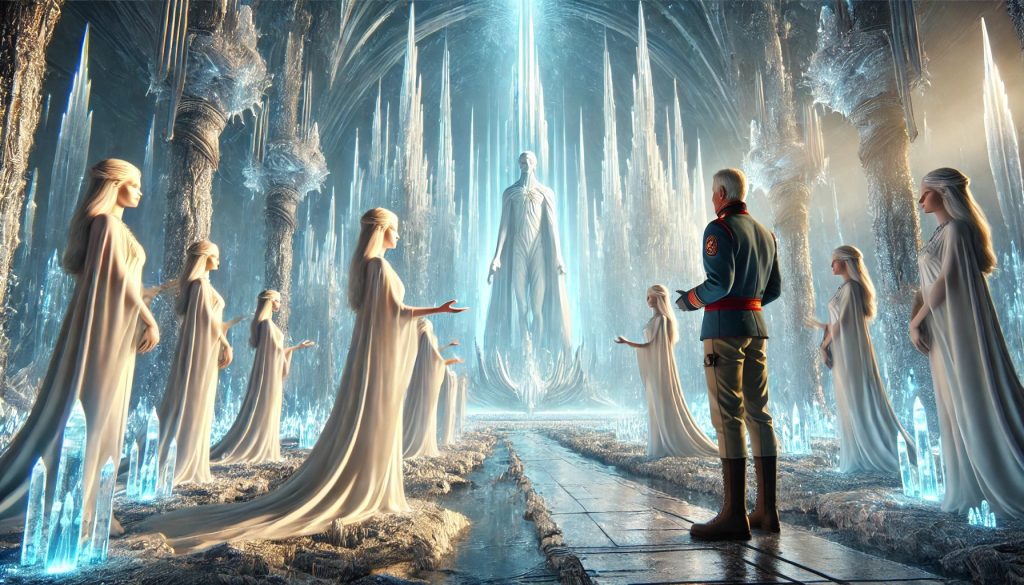 Ci viene offerta un certo tipo di bevanda tiepida con un sapore mai assaggiato finora. È deliziosa. Dopo circa dieci minuti, due dei nostri stupefacenti ospiti vengono a raggiungerci ed annunciano che devo accompagnarli. Non ho altra scelta che seguirli. Lascio il mio operatore radio e camminiamo per una breve distanza ed entriamo in ciò che sembrava essere un ascensore. Scendiamo per un po’ di tempo, la macchina si ferma e la porta dell’ascensore scivola silenziosamente verso l’alto. Procediamo poi verso il basso un lungo corridoio illuminato da una luce rosa che sembra emanare dai muri stessi. Uno degli esseri ci fa segno di fermarci davanti ad una grande porta. Sulla porta c’è un’iscrizione che non riesco a leggere. La grande porta si apre silenziosamente e sono invitato ad entrare. Uno dei miei ospiti parla. “Non abbiate timore Ammiraglio, avrete un incontro col Maestro”….Entro dentro ed i miei occhi contemplano la bella colorazione che sembra riempire il locale. Allora comincio a vedere ciò che mi circonda. Quello che vedono i miei occhi è il più bello spettacolo della mia esistenza. È infatti troppo bello e meraviglioso da descrivere. È squisito e delicato. Non penso che esista un termine umano che possa correttamente descriverlo in tutti i suoi dettagli. I miei pensieri sono cordialmente interrotti da una voce calda e melodiosa: “Vi auguro il benvenuto nel nostro dominio, Ammiraglio”. Vedo un uomo coi tratti delicati e con il segno degli anni sul viso. È seduto vicino ad un lungo tavolo. Mi invita ad accomodarmi su una delle sedie. Appena mi sono seduto, riunisce l’estremità delle sue dita e sorride. Parla delicatamente e mi comunica ciò che segue: “Vi abbiamo permesso, Ammiraglio, di entrare qui perché siete di carattere nobile e conosciuto nel Mondo di Superficie”.Il Mondo di Superficie, rimasi senza fiato! “Sì” , replicò il Maestro, sorridendo: “Siete nel dominio degli Ariani, il Mondo Interiore della Terra. Non ritarderemo per molto tempo la vostra missione, e sarete scortati verso la superficie fino una certa distanza. Ma adesso, Ammiraglio, vi dico perché siete stati convocati qui. Il nostro interesse comincia a causa delle prime bombe atomiche su Hiroshima e Nagasaki, in Giappone. In quel momento, abbiamo mandato le nostre macchine volanti, i “Flügelräds” in superficie per indagare su ciò che la vostra razza aveva fatto. Questa è ovviamente storia passata adesso, caro Ammiraglio, ma devo proseguire. Vedete, non abbiamo interferito mai prima nelle guerre e nelle barbarie della vostra razza ma, adesso dobbiamo, perché avete imparato a manipolare un potere che non è degli uomini, l’energia atomica. I nostri emissari hanno già consegnato dei messaggi ai governanti del vostro mondo e, tuttavia, questi non ne tengono conto. Adesso, siete stato scelto per testimoniare che il nostro mondo esiste. Vedete, Ammiraglio, la nostra cultura e la nostra scienza sono avanti di parecchie migliaia di anni su quelle della vostra razza “.