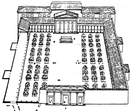 Sul fondo fuoriesce dalla linea del portico il Tempio della Pace, col suo pronao ottastilo. Ai lati del tempio vi erano due biblioteche, una greca e una latina. Il complesso divenne un museo dove raccogliere i tesori sottratti alle popolazioni conquistate da Roma, quindi, i tesori delle campagne di Vespasiano e, specialmente, Tito, che nel 71 d.C. aveva conquistato Gerusalemme, appropriandosi di tutti gli oggetti contenuti nel suo famoso tempio. I tesori giudaici affluirono a Roma (testimonianza ne sono i rilievi dell’Arco di Tito) e finirono per accrescere la collezione di opere d’arte già presenti nel Tempio della Pace.