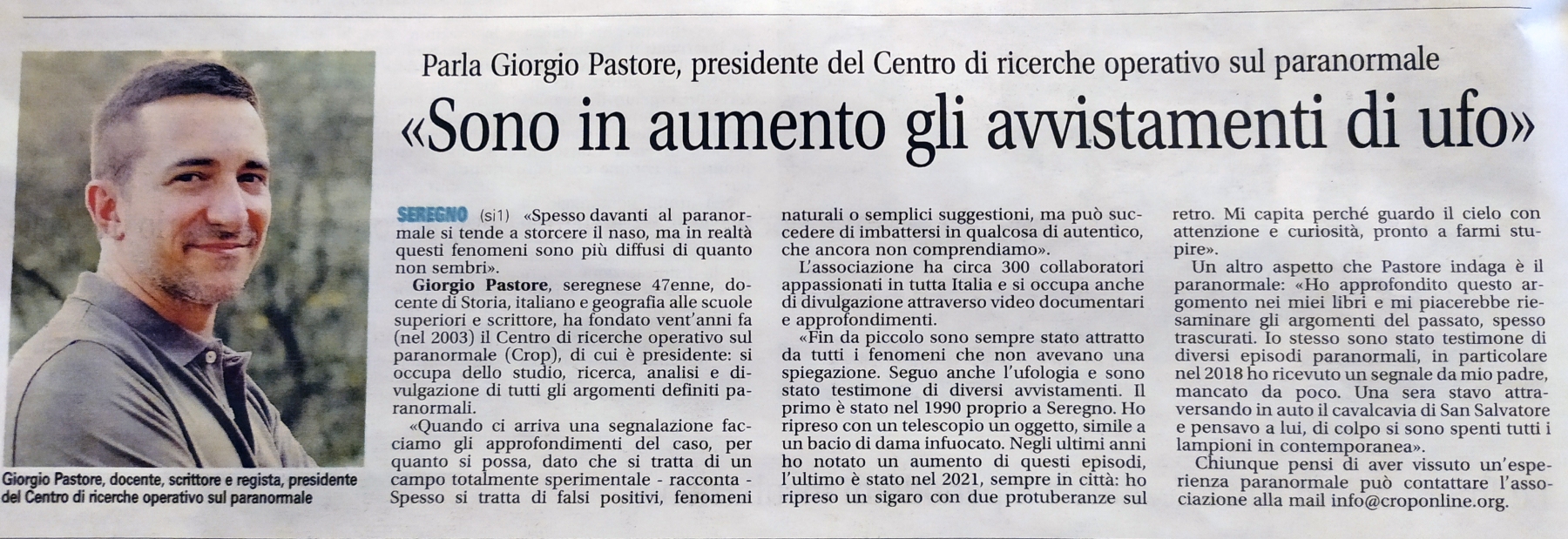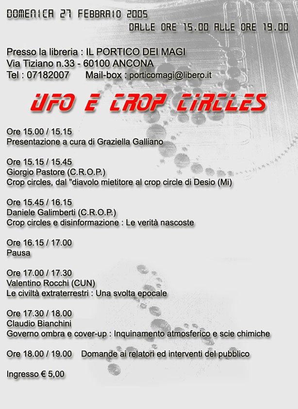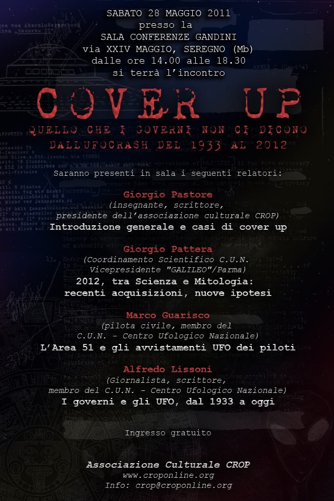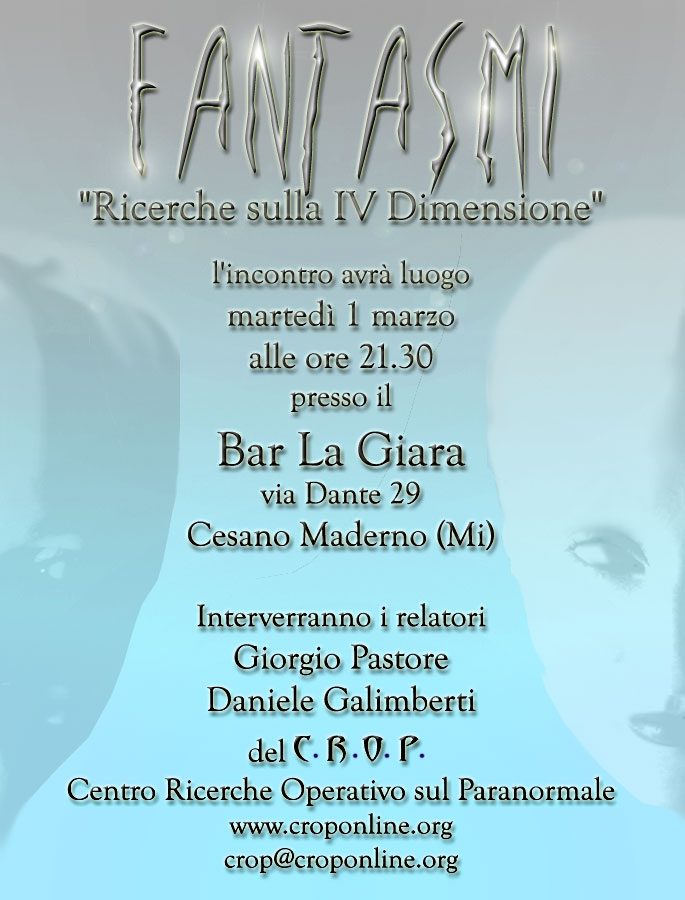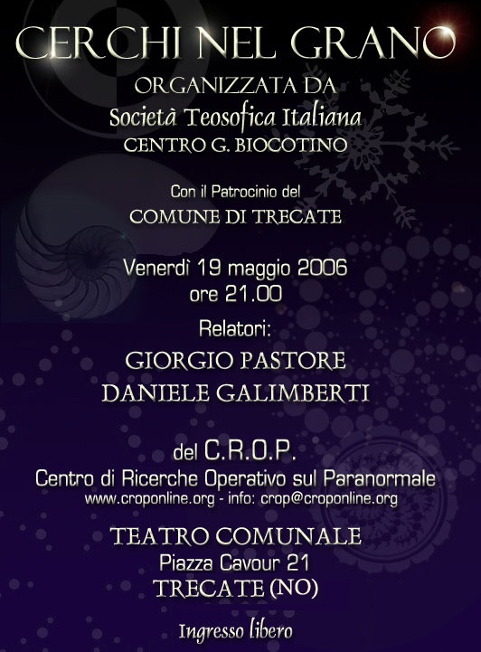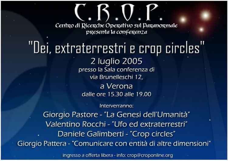 Qui di seguito riportiamo in ordine cronologico (dal più recente al più datato) l’archivio storico di alcuni eventi organizzati dal Centro di Ricerche Operativo sul Paranormale o a cui ha partecipato il professor Giorgio Pastore (presidente del C.R.O.P.) nel corso degli anni, a partire dalla fondazione dell’associazione culturale. Sono comprese anche indagini e conferenze.