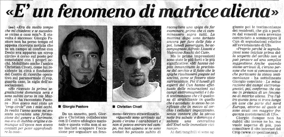 Il cerchio di Desio nel 2004 rimane ancora oggi uno dei casi più interessanti della Lombardia, in grado di alimentare domande sul significato e l’origine di queste misteriose formazioni. Questo evento fu molto importante per noi, fu determinante, perché da lì si scelse di dare vita un anno dopo alla nostra associazione culturale, il C.R.O.P. centro di Ricerche Operative sul Paranormale.